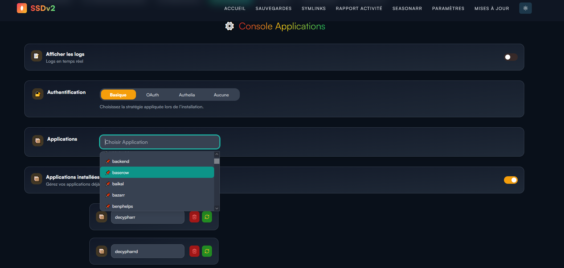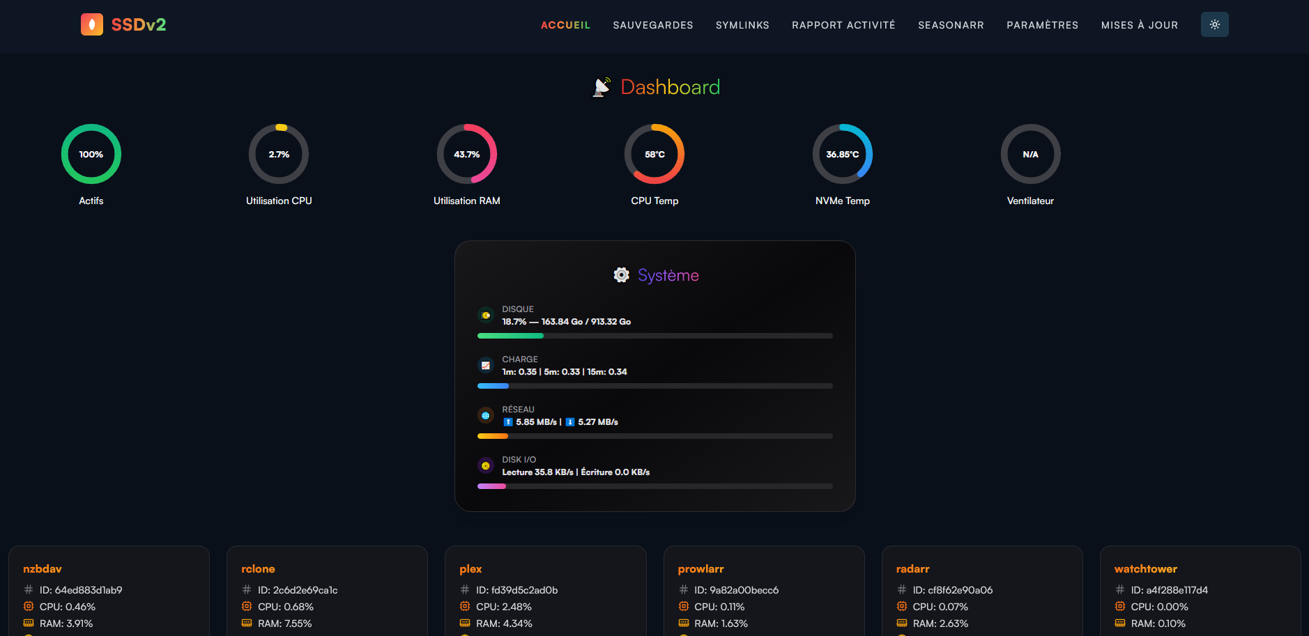Une console web unifiée pour piloter un environnement SSDv2 : état du système, sauvegardes, gestion des symlinks, rapport d’activité, console applications, mises à jour, et un module dédié Seasonarr.