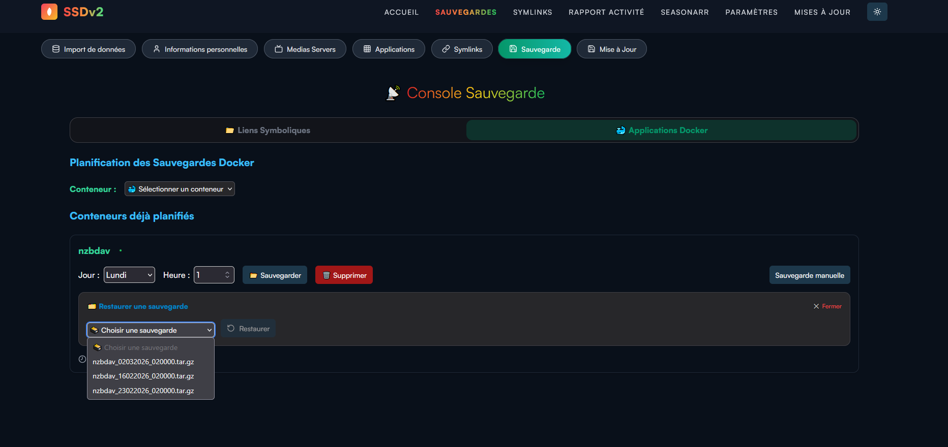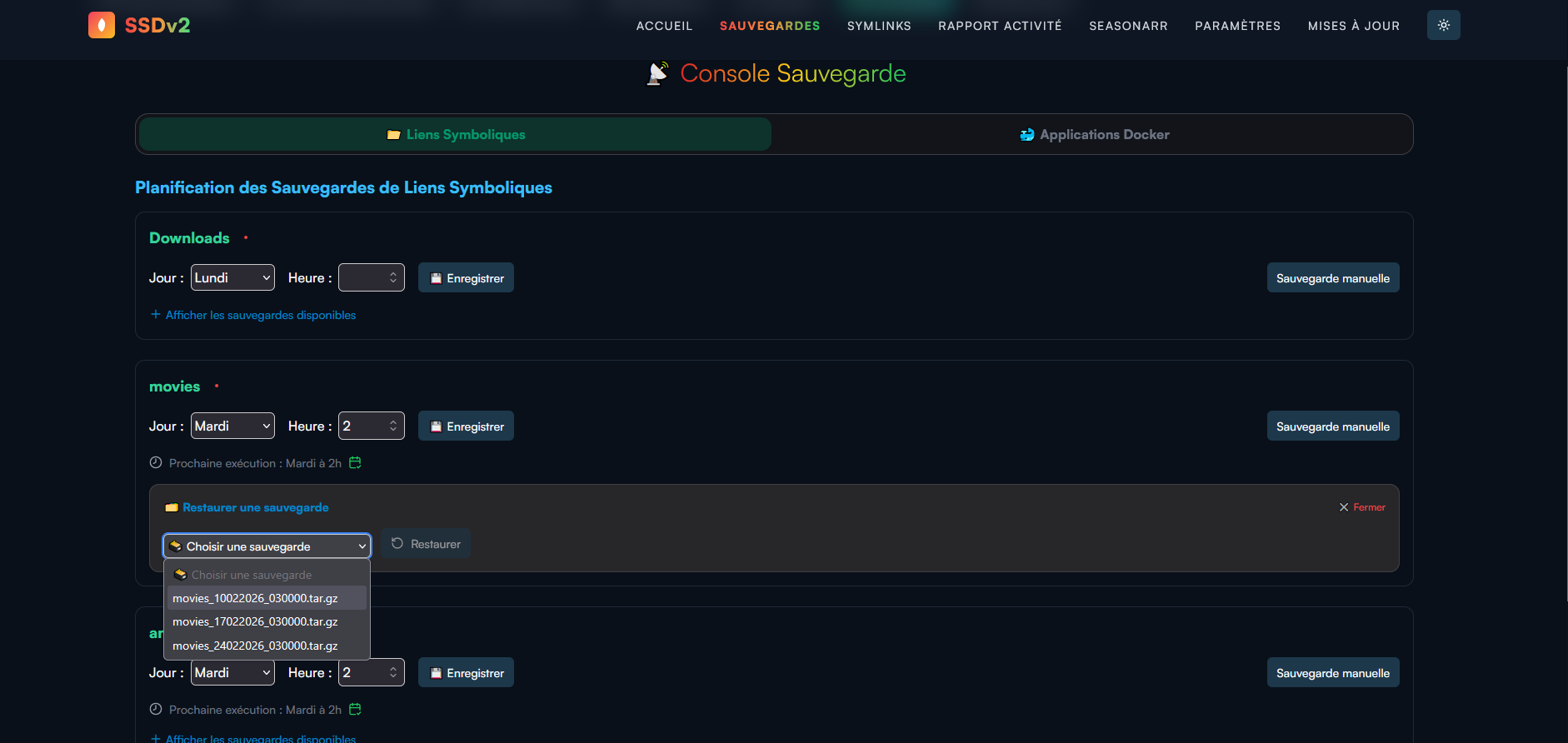 - Sauvegardes → Console Sauvegarde (Symlinks / Applications Docker)