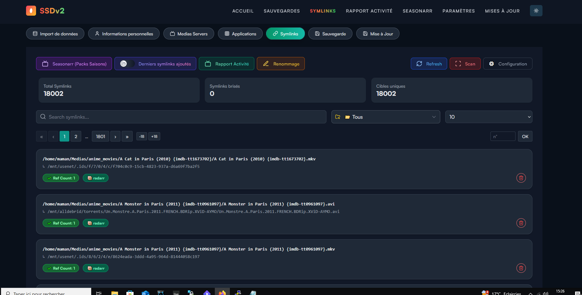 - stats globales : Total symlinks, Symlinks brisés, Cibles uniques