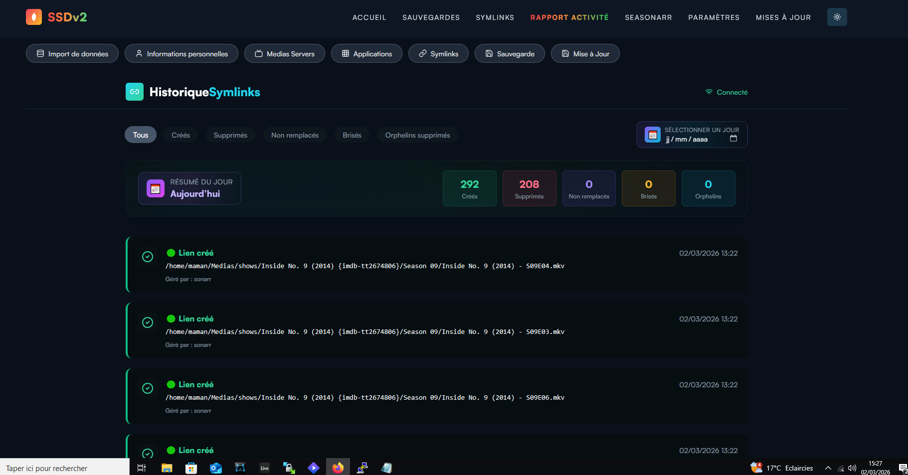 Ce que couvre l’historique : - résumé du jour (ex: créés, supprimés, non remplacés, brisés, orphelins) - filtres par type d’événement (Tous / Créés / Supprimés / etc.) - items horodatés avec source (ex: “Géré par : sonarr”)