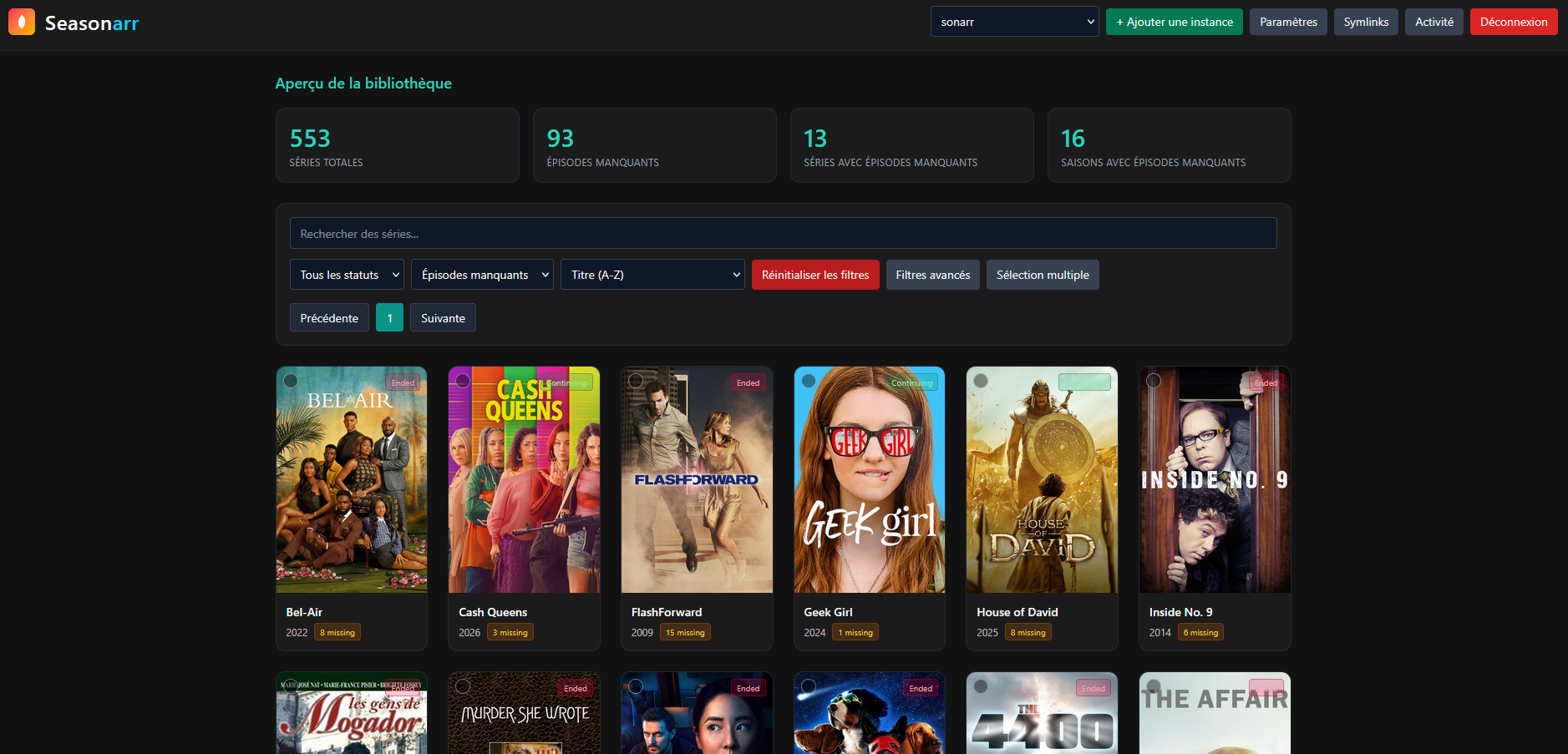 Ce que montre la vue : - stats rapides : - séries totales - épisodes manquants - séries avec épisodes manquants - saisons avec épisodes manquants - recherche + filtres (statuts, manquants, tri) - affichage posters type “catalogue” - gestion multi-instance (bouton “Ajouter une instance” + select instance)